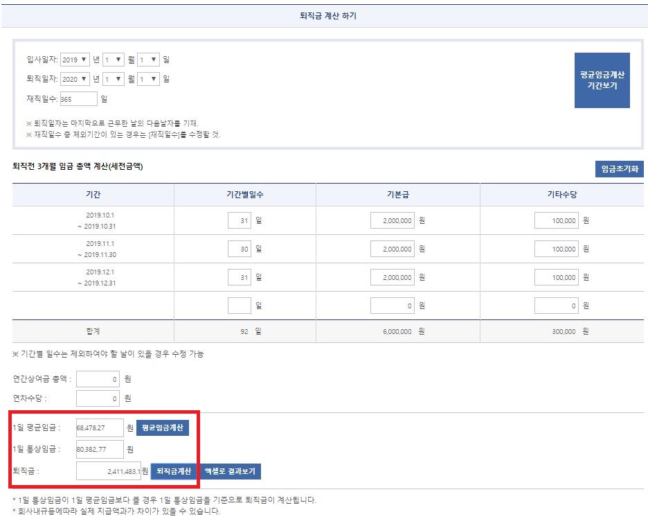 다만, 퇴직금을 계산할 때의 기준이 평균임금일 때는 얼마이며, 통상임금일 때는 얼마인지를 확인하신 후에 퇴직금 계산기로 계산을 해보는 것이 가장 좋은 방법이라는 말씀을 드리고 싶었습니다.